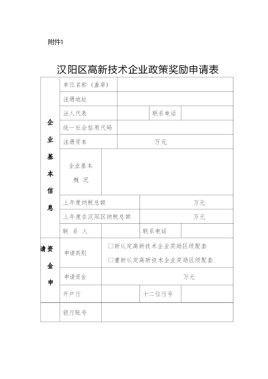1、汉阳区高新技术企业政策奖励申请表(盖公司公章);