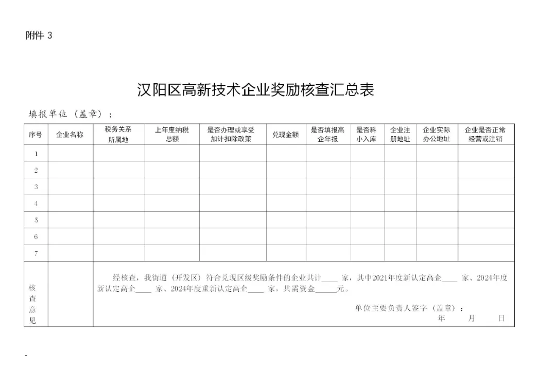 2、审批通过后进行线下提交,企业将申报材料一式三份提交至所属辖区街道办,街道办对申报资料进行审核,填写汉阳区高新技术企业奖励核查汇总表并加盖公章,提交至区经科局。