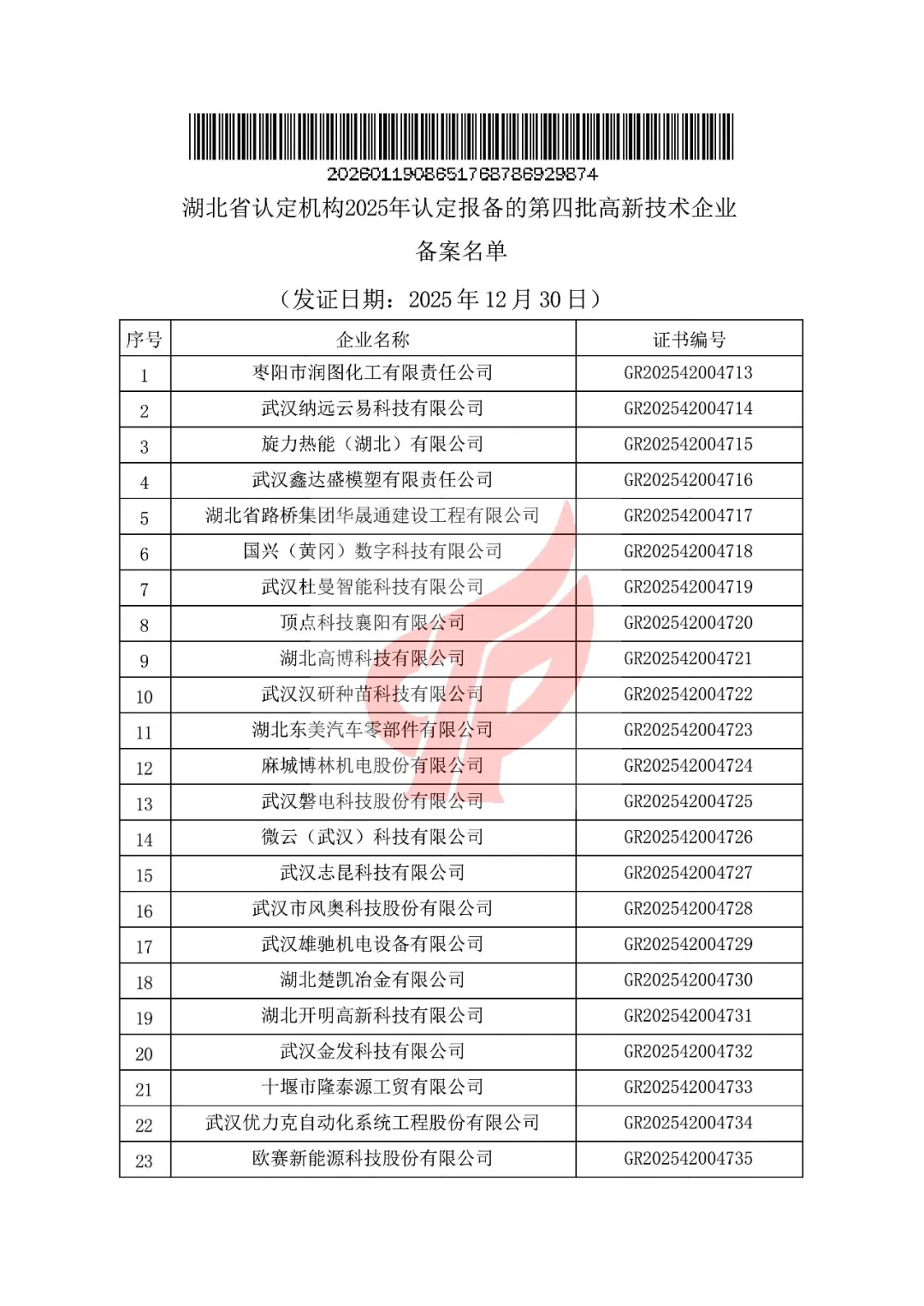 附件:湖北省认定机构2025年认定报备的第四批高新技术企业备案名单